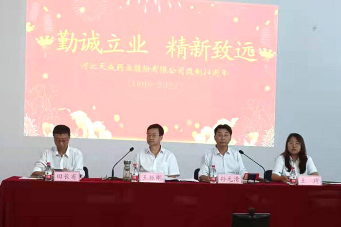 金秋送爽、丹桂飄香,又是一年豐收季,在滿載收獲的時節,我們即將迎來國慶節和黨的二十大。在這喜悅的時刻,天成藥業迎來企業改制24周年紀念日。9月30日下午,公司在三分廠會議室舉行了公司改制24周年慶祝大會。河北天成藥業股份有限公司董事長王振剛、天成藥業總經理、渤海分公司總經理孫元清、天成藥業副總經理、渤海分公司常務副總經理田長有 、天成藥業常務副總經理王琦出席會議,天成藥業、道恩藥業全體中層及以上干部,全體科室后勤人員現場參會,渤海分公司、天津應天成科技有限公司全體不能到現場的人員通過視頻鏈接網上參會。會議由總經理孫元清主持。