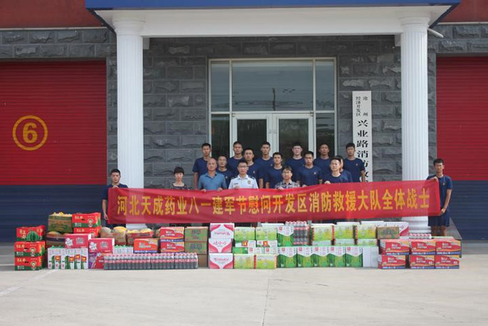 每年的這個時候,天成藥業都會用實際行動詮釋著軍民一家親的深厚情誼。今年也不例外,天成藥業為全體戰士們精心準備了各種各樣的慰問品:西瓜、哈密瓜、礦泉水、飲料、牛奶和方便面等豐富的食品,每一份禮物都飽含著對消防戰士們的關心與支持。