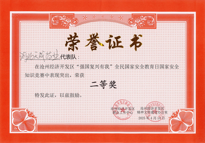 滄州經(jīng)濟(jì)開發(fā)區(qū)舉辦“強(qiáng)國復(fù)興有我”國家安全知識競賽活動 天成藥業(yè)代表隊(duì)榮獲二等獎