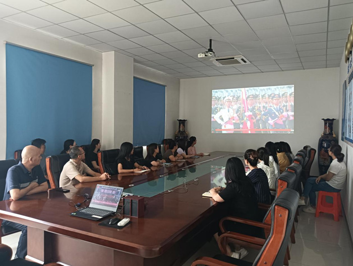 當天上午,黨員們齊聚公司會議室,懷著崇敬的心情等待閱兵儀式開始。9時許,閱兵儀式正式拉開帷幕,當屏幕中出現整齊列隊的受閱方隊、先進精良的武器裝備以及翱翔天際的空中梯隊時,大家紛紛被震撼,會議室里不時傳來陣陣贊嘆聲。