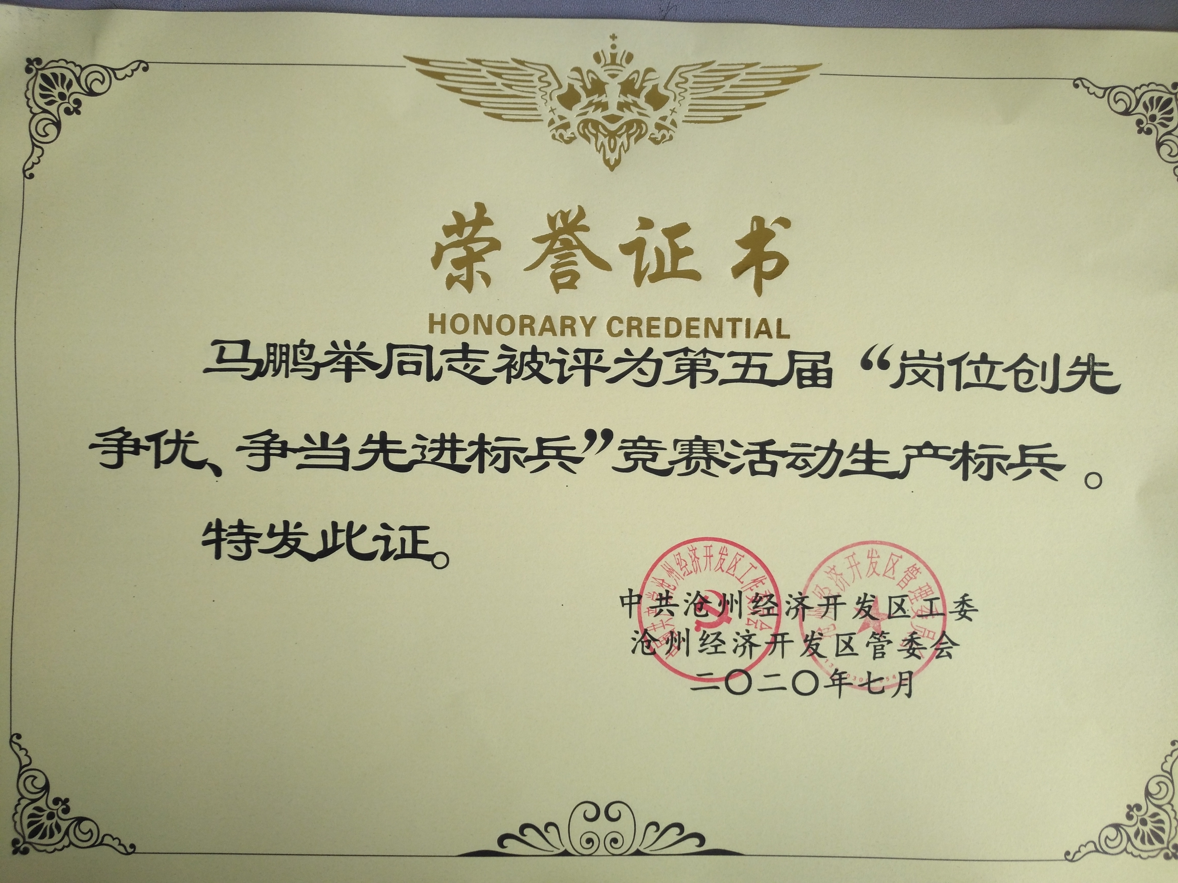 近日,滄州開發區企業委員會開展第五屆“崗位創先爭優、爭當先進標兵”競賽活動,公司總經理孫元清被授予經營管理標兵、綜合部部長呂斌被授予安全標兵榮譽稱號、設備部部長劉植梅被授予技術創新標兵榮譽稱號、原料藥車間馬鵬舉、輸液二車間丁傳彥被授予生產標兵榮譽稱號。此次評選表彰工作圍繞提高管理水平、保證安全生產、增加經濟效益、促進技術進步,以創一流管理、創優秀團隊、創最佳效益為目標,立足崗位創先爭優,開展爭當標兵競賽,引導全體黨員和全體員工以昂揚向上的精神風貌、更加出色的工作業績,體現黨組織戰斗力,展示黨員和先進員工風采,倡導塑造企業先進文化,帶領廣大群眾為企業和諧快速發展多做貢獻。